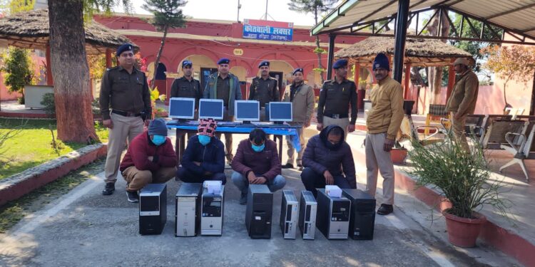 जनपद में जगह-जगह चल रहे इस बड़े खेल पर फोकस करते हुए गठित पुलिस टीम ने लगातार एक्टिव रह कर सटीक सूचना के आधार पर कुल 04 अभियुक्तों को भारी मात्रा में इलैक्ट्रोनिक सामान कम्प्यूटर, सीपीयू, प्रिंटर, नकदी, घटना में इस्तेमाल किए जाने वाले कई मोबाइल फोन तथा अन्य दस्तावेज आदि के साथ दबोचा।