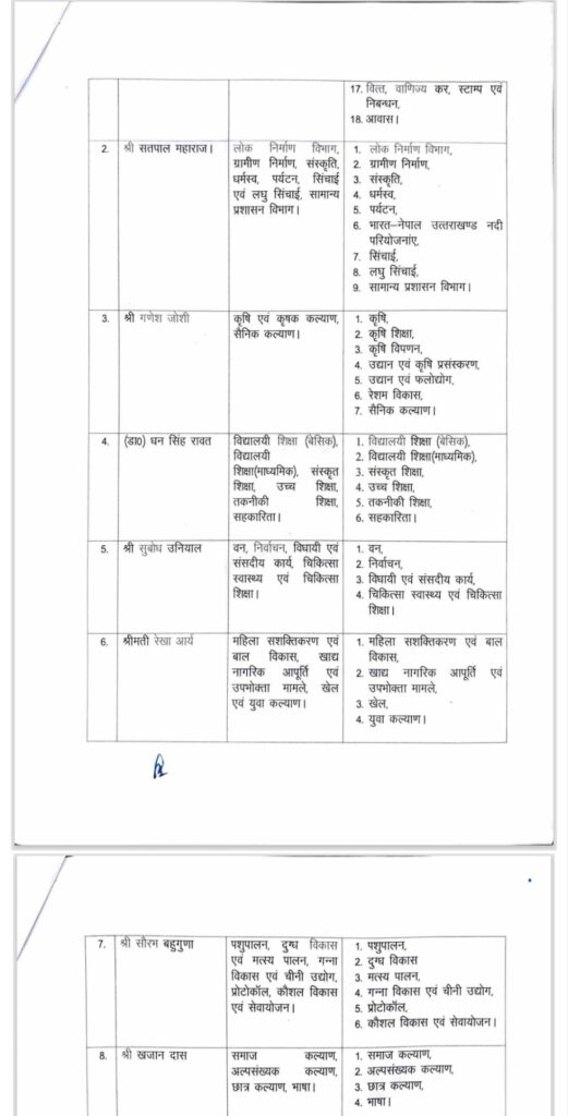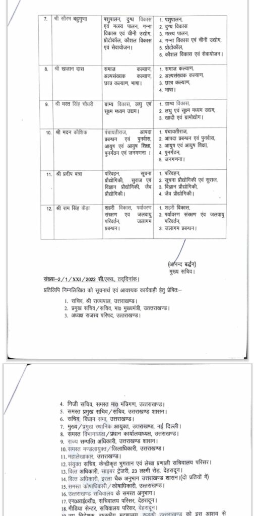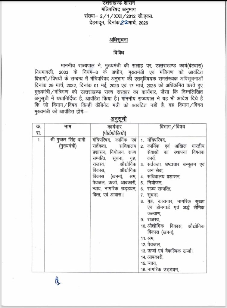 उत्तराखंड/ सीएम धामी के कहा कि हमारी सरकार के बीते चार साल, सेवा, सुशासन और जनकल्याण को समर्पित रहे हैं, इसी क्रम में मंत्रिमंडल में नए शामिल सदस्यों सहित मंत्रिमंडल के सभी सहयोगियों के मध्य कार्य आवंटन भी कर दिया गया है। मंत्रिमंडल के सभी सदस्य अनुभवी हैं और जनसेवा से गहराई से जुड़े हैं।जनसेवा को सर्वोपरी रखते हुए, उत्तराखंड को विकसित भारत का अग्रणी एवं श्रेष्ठ राज्य बनाने में पूरी सरकार अपना योगदान प्राणोप्रण से देगी।हम सभी को उत्तराखंड की सवा करोड़ देवतुल्य जनता की सेवा करने का मौका मिला है, और यह सेवा भाव ही हमें अपनी देव तुल्य जनता के सपनों एवं आकांक्षाओं को पूर्ण करने के लिए सदैव प्रेरित करता है।