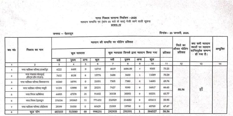देहरादून नगर निगम में हुई करीब 56% प्रतिशत की पोलिंग हुई। देहरादून जनपद में 58.56 पोलिंग हुई। उत्तराखंड में 66 प्रतिशत मतदान हुआ है। लिस्ट में देखे कहां कहां क्या रही स्थिति