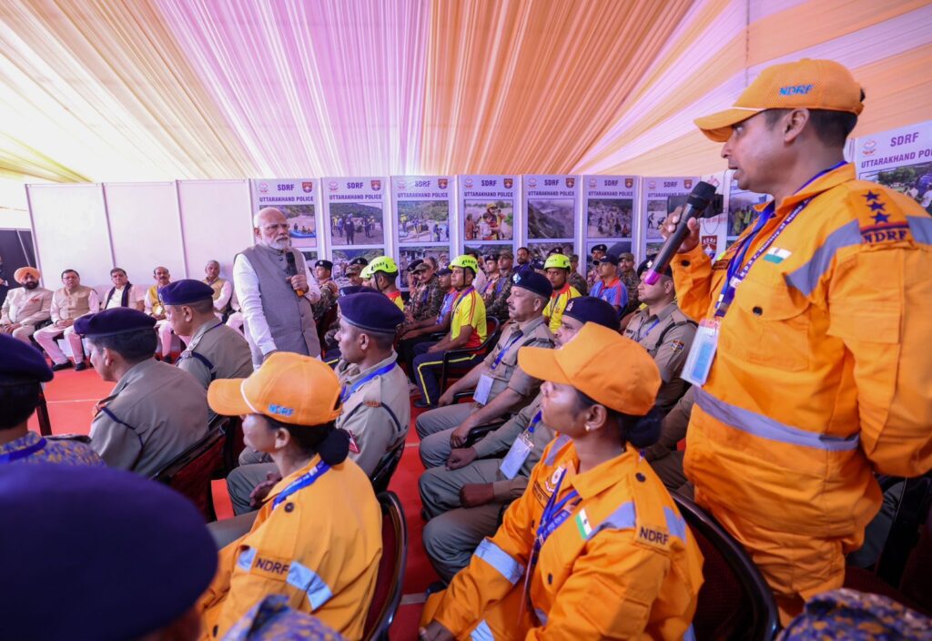 उत्तराखंड में प्राकृतिक आपदा से हुए नुकसान का जायजा लेने पहुंचे प्रधानमंत्री श्री नरेंद्र मोदी ने गुरुवार को जौलीग्रांट एअरपोर्ट पर आपदा राहत कार्यों की गहन समीक्षा की। प्रधानमंत्री ने इस दौरान अलग-अलग क्षेत्रों में आपदा से हुए नुकसान का विस्तार से जानकारी लेने के साथ ही राहत एवं बचाव कार्यों की ताजा स्थिति और भविष्य की चुनौतियों पर राज्यपाल ले.ज. गुरमीत सिंह (से.नि.), मुख्यमंत्री श्री पुष्कर सिंह धामी, केन्द्रीय राज्य मंत्री अजय टम्टा तथा राज्य के सांसदों सहित वरिष्ठ अधिकारियों के साथ विचार-विमर्श किया। प्रधानमंत्री श्री नरेंद्र मोदी ने धराली, थराली सहित राज्य के आपदा प्रभावित अन्य क्षेत्रों में संचालित राहत एवं बचाव अभियानों में एनडीआरएफ, एसडीआरएफ सहित राज्य सरकार के विभिन्न विभागों के प्रयासों की सराहना की और राहत बचाव कार्यों में जुटे राज्य व केन्द्र सरकार के संगठनों के कार्मिकों से भेंट कर उनके अनुभव साझा किए। प्रधानमंत्री ने आपदा पीड़ितों से भी मुलाकात कर उनका ढांढस बंधाने के साथ ही समुचित मदद का भरोसा दिलाया।
