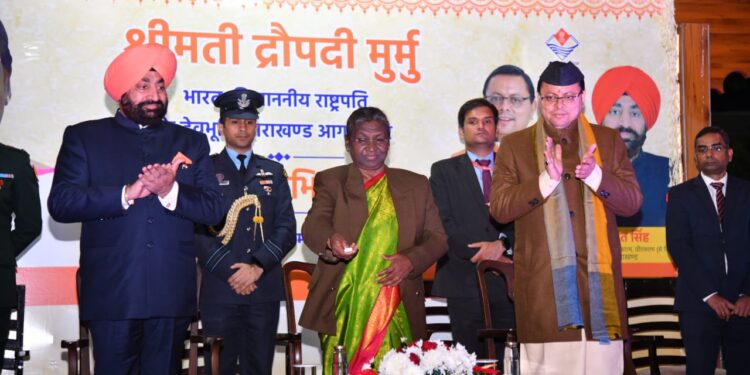 राष्ट्रपति ने कहा कि स्वयं पर्वतराज हिमालय और उत्तराखंड के शूरवीर लोग भारत माता के प्रहरी भी रहे हैं। हमारे वर्तमान सीडीएस जनरल अनिल चौहान जी उत्तराखंड के ही सपूत हैं। भारत के प्रथम सीडीएस जनरल बिपिन रावत जी भी इसी धरती की विभूति थे। 1990 के दशक में जनरल बिपिन चंद्र जोशी जी ने चीफ ऑफ आर्मी स्टाफ के रूप में भारत माता की सेवा की थी। कारगिल युद्ध में अपने प्राणों की आहुति देकर देश की रक्षा करने वाले मेजर राजेश सिंह अधिकारी और मेजर विवेक गुप्ता का बलिदान सभी देशवासी हमेशा याद रखेंगे। उन दोनों सूरमाओं को मरणोपरांत महावीर चक्र से सम्मानित किया गया था। 1962 के युद्ध में अपने प्राणों का उत्सर्ग करने वाले महावीर चक्र से सम्मानित जसवंत सिंह रावत एक अमर सेनानी के रूप में भारतवासियों को हमेशा याद रहेंगे। स्वाधीनता के तुरंत बाद कश्मीर में घुसपैठियों से लोहा लेते हुए अपने प्राणों का बलिदान करने वाले सैनिक दीवान सिंह को कृतज्ञ राष्ट्र ने महावीर चक्र से सम्मानित किया था। भारत माता के लिए मर-मिटने वाले उन सभी वीरों को मैं सादर नमन करती हूं और ऐसे वीरों की जननी उत्तराखंड की भूमि को शत-शत प्रणाम करती हूं। इस धरती के शूरवीरों को अशोक-चक्र और कीर्ति-चक्र से भी सम्मानित किया गया है। मैं सभी देशवासियों की ओर से उत्तराखंड के वीर सपूतों के प्रति कृतज्ञता व्यक्त करती हूं।