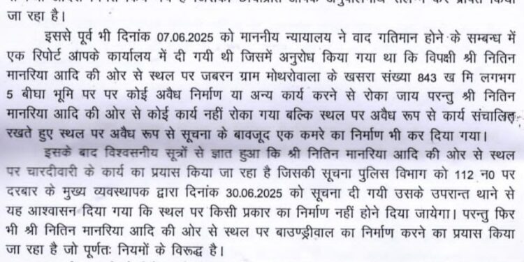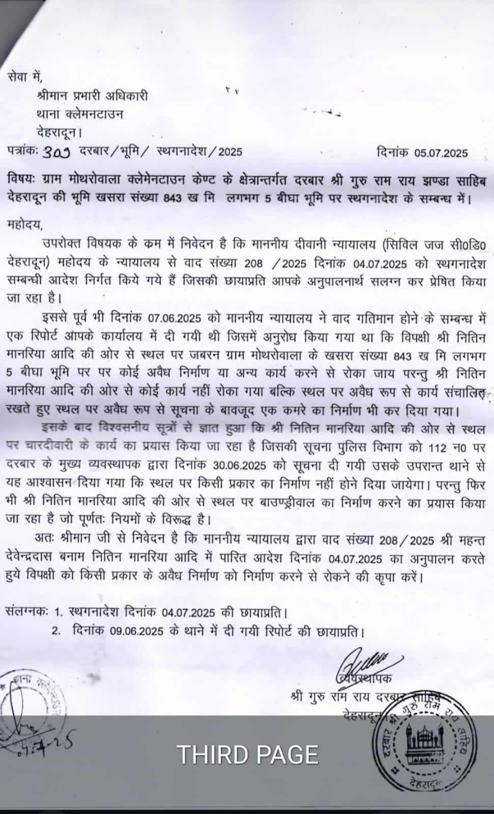 देहरादून, 15 जुलाई। दून में जमीन कब्जाने के मामले रुकने का नाम नहीं ले रहे हैं। ताजा मामला थाना कलेमेनटाउन के क्षेत्रान्तर्गत प्रकाश में आया है। मोथरोवाला क्षेत्र स्थित श्री दरबार साहिब की जमीन पर अवैध कब्जे और निर्माण के प्रयासों को लेकर माननीय सिविल न्यायालय (सीनियर डिविजन) द्वारा सख्त रुख अपनाया गया है। न्यायालय ने दिनांक 4 जुलाई 2025 को विपक्षीगणों के विरुद्ध स्थगन आदेश (निषेधाज्ञा) जारी करते हुए उन्हें किसी भी प्रकार के निर्माण अथवा भूमि के क्रय-विक्रय गतिविधियों से रोक दिया है।