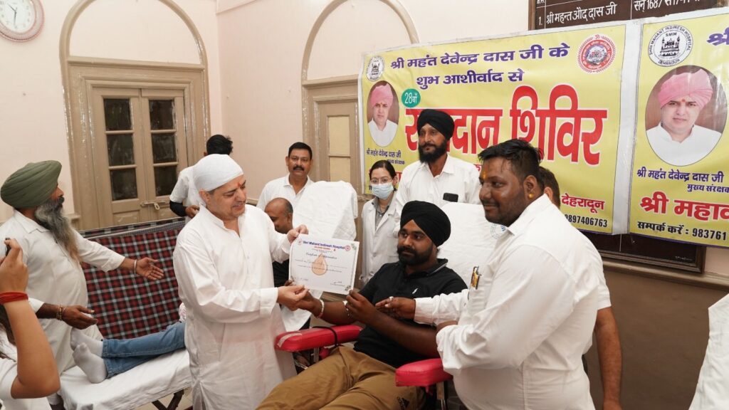श्री गुरु राम राय जी महाराज को समर्पित स्वैच्छिक रक्तदान शिविर में संगत ने 105 यूनिट रक्तदान किया। श्री गुरु राम राय जी महाराज के महानिर्वाण पर्व पर महाकाल सेवा समिति द्वारा श्री महंत इन्दिरेश अस्पताल ब्लड बैंक के सहयोग से रक्तदान शिविर का आयोजन किया गया। रक्तदान शिविर में परम पूज्य श्रीमहंत देवेन्द्र दास जी महाराज ने दीप प्रज्जवलित कर शिविर का शुभारंभ किया। श्री महाराज जी ने रक्तदाताओं को स्मृति चिन्ह देकर सम्मानित किया और सभी को आर्शीवाद दिया। उन्होंने श्री महाकाल सेवा समिति द्वारा किये जा रहे रचनात्मक और सामाजिक कार्यों की भूरि-भूरि प्रशंसा की। शिविर में पुरूषों एवं महिलाओं ने उत्साहपूर्वक रक्तदान किया। इस दौरान प्रख्यात भागवताचार्य श्री सुभाष जोशी, श्री पृथ्वीनाथ सेवादल से संजय गर्ग, नवीन गुप्ता, विवेक मोहन श्रीवास्तव व महाकाल सेवा समिति के रौशन राणा, हेमराज अरोड़ा, विनय प्रजापति, आयुष जैन, गौरव जैन, बालकिशन शर्मा, संजीव गुप्ता, नितिन अग्रवाल, राहुल माटा, विक्रम चौधरी, कृतिका राणा, अनुष्का राणा आदि उपस्थित रहे। श्री महंत इन्दिरेश अस्पताल के ब्लड बैंक टीम का प्रतिनिधित्व अमित चन्द्रा व डॉं0 सुप्रीत कौर ने किया।