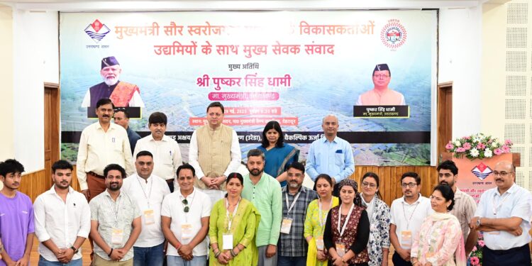 मुख्यमंत्री श्री पुष्कर सिंह धामी ने गुरूवार को मुख्यमंत्री आवास स्थित मुख्य सेवक सदन में मुख्यमंत्री सौर स्वरोजगार योजना के विकासकर्ताओं के साथ मुख्य सेवक संवाद कार्यक्रम में प्रतिभाग किया। इस अवसर पर मुख्यमंत्री ने घोषणा की कि मुख्यमंत्री सौर स्वरोजगार योजना से जुड़ी महिलाओं को सौर सखी नाम दिया जायेगा। मुख्यमंत्री सौर स्वरोजगार योजना और स्वरोजगार से जुड़ी अन्य योजनाओं को व्यापक स्तर पर बढ़ावा देने विकासखण्डों में विशेष शिविरों के आयोजन किये जायेंगे। सौर प्लांटों के रख-रखाव के लिए प्रत्येक जनपद में लोगों को प्रशिक्षण दिया जायेगा।
